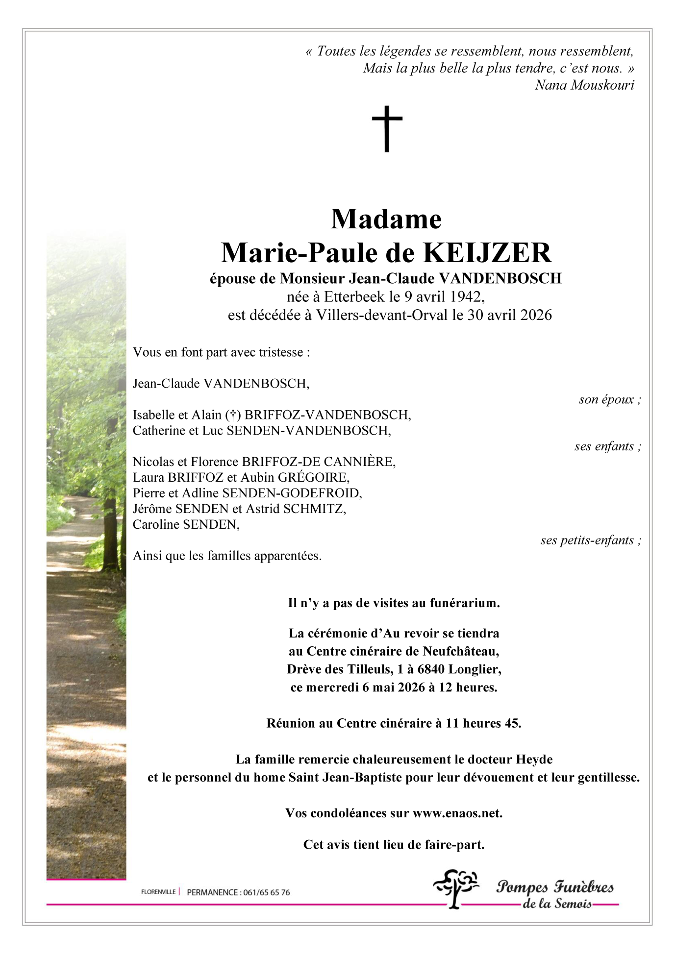 Avis de décès de Madame Marie-Paule de KEIJZER
