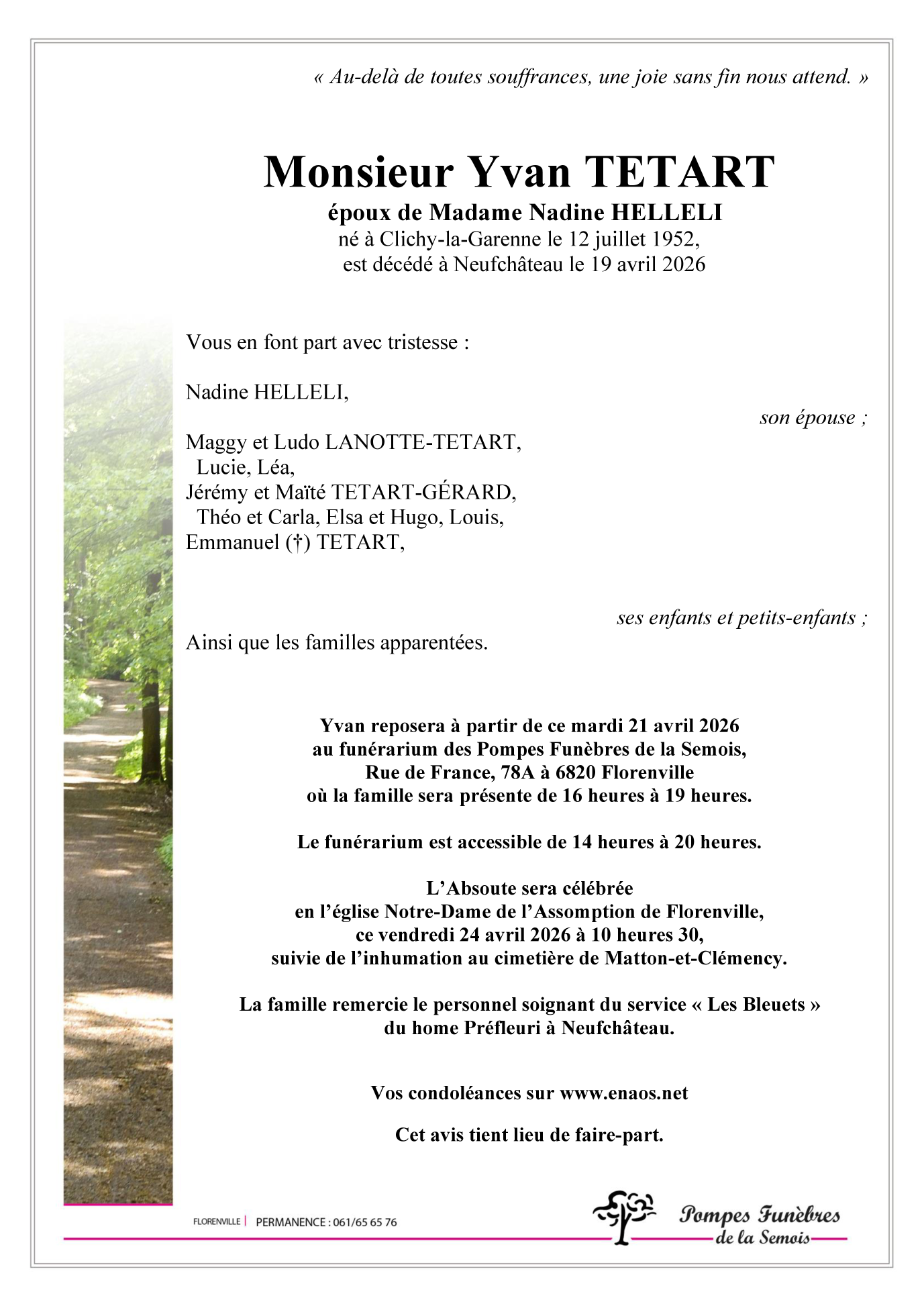 Avis de décès de Monsieur Yvan TETART