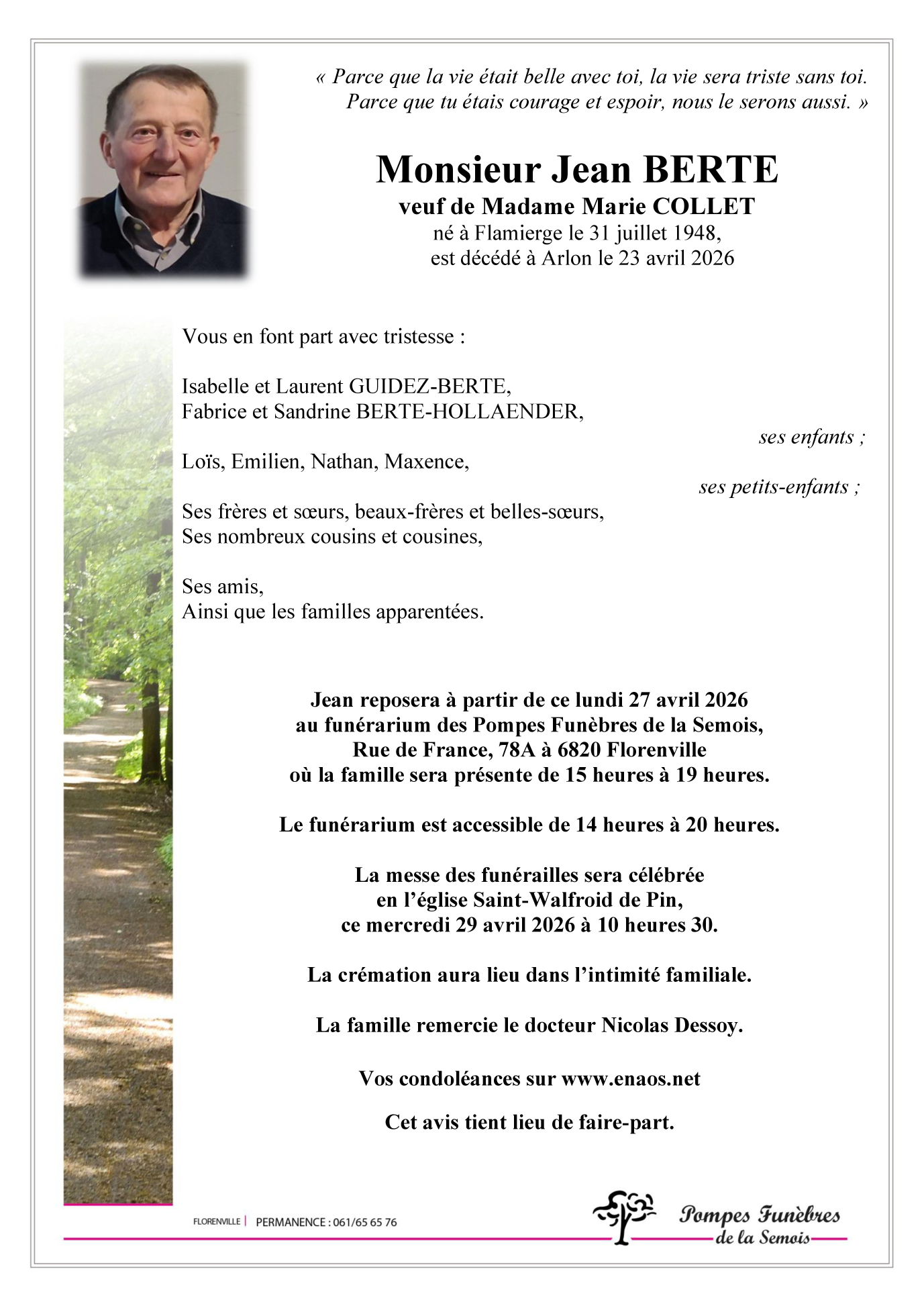 Avis de décès de Monsieur Jean BERTE