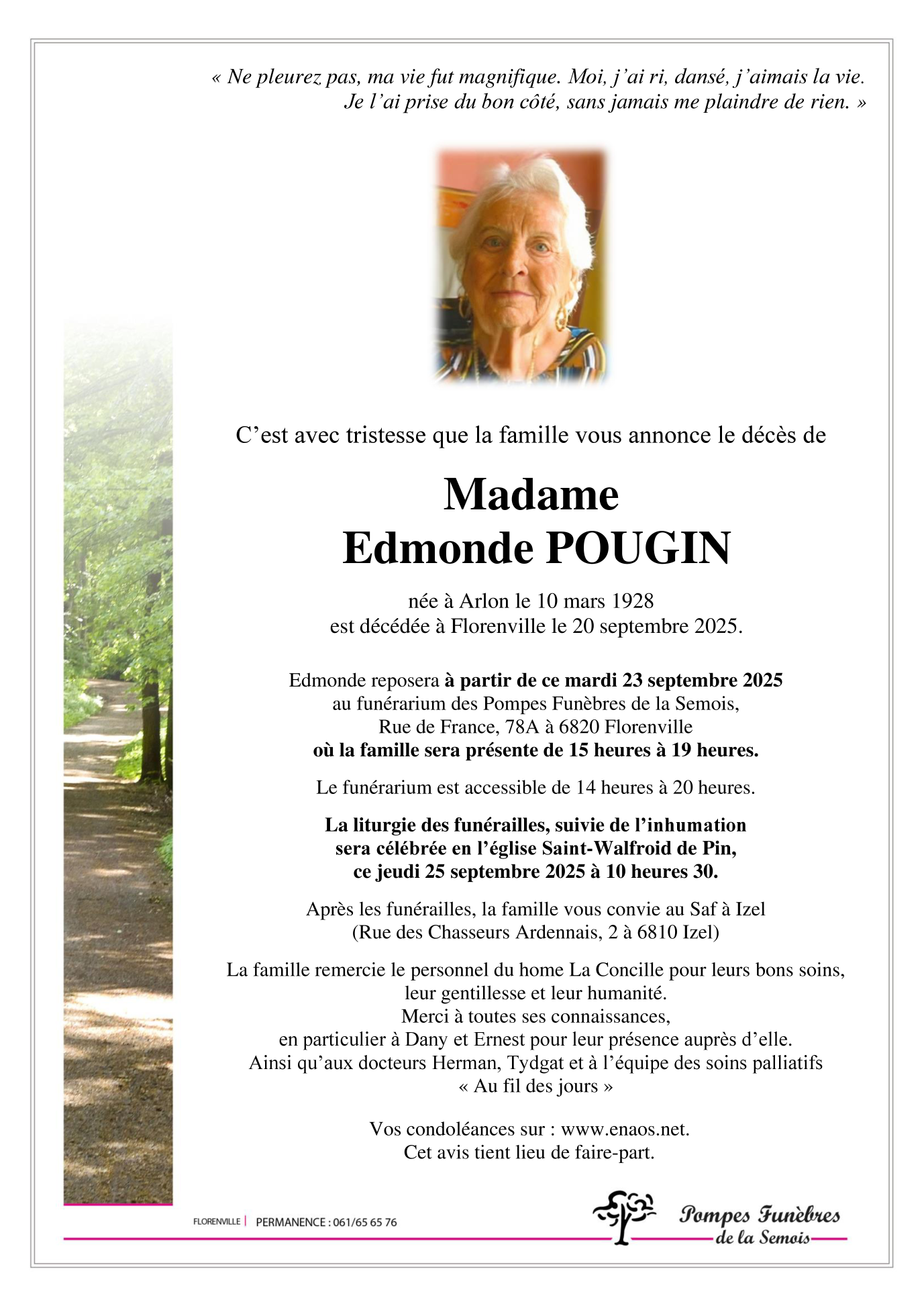 Décédée à Florenville (6820) le samedi 20 septembre 2025 à l'âge de 97 ans