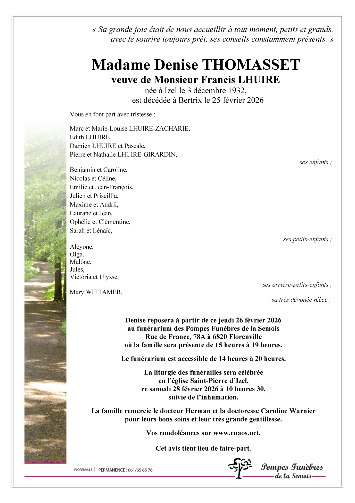Décédée à Bertrix (6880) le mercredi 25 février 2026 à l'âge de 93 ans