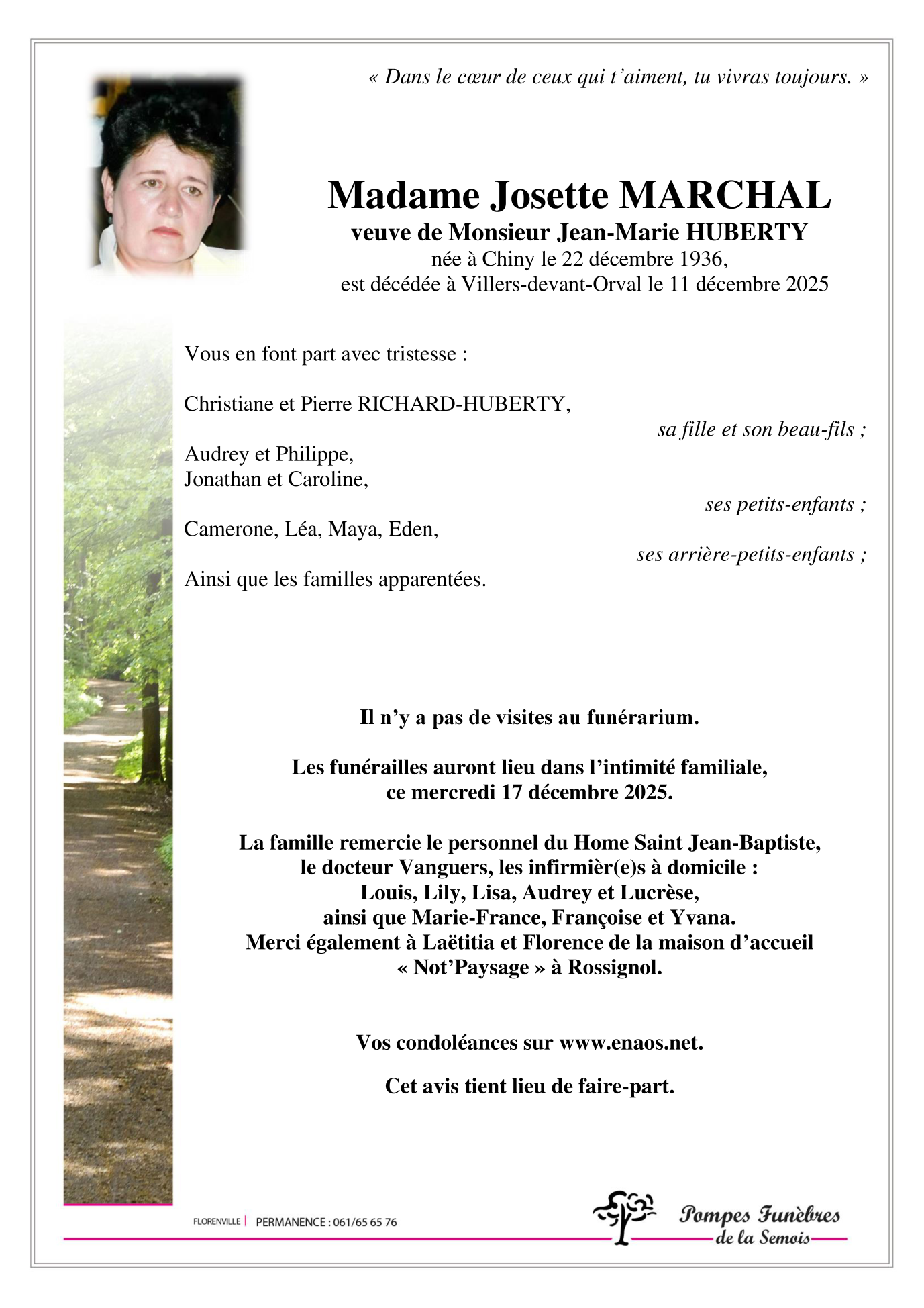 Décédée à Villers-Devant-Orval (6823) le jeudi 11 décembre 2025 à l'âge de 88 ans