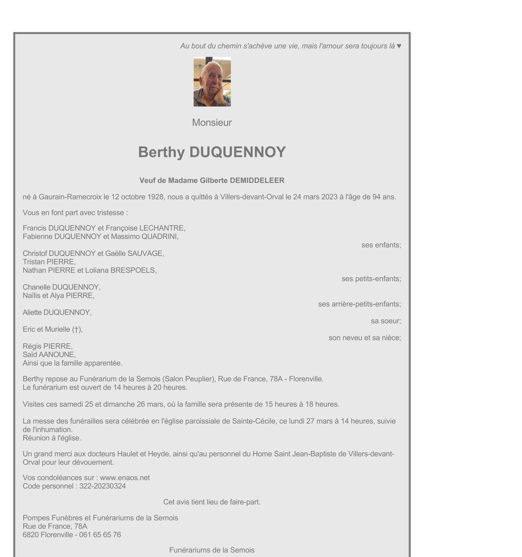 Décédé à Villers-Devant-Orval (6823) le vendredi 24 mars 2023 à l'âge de 94 ans