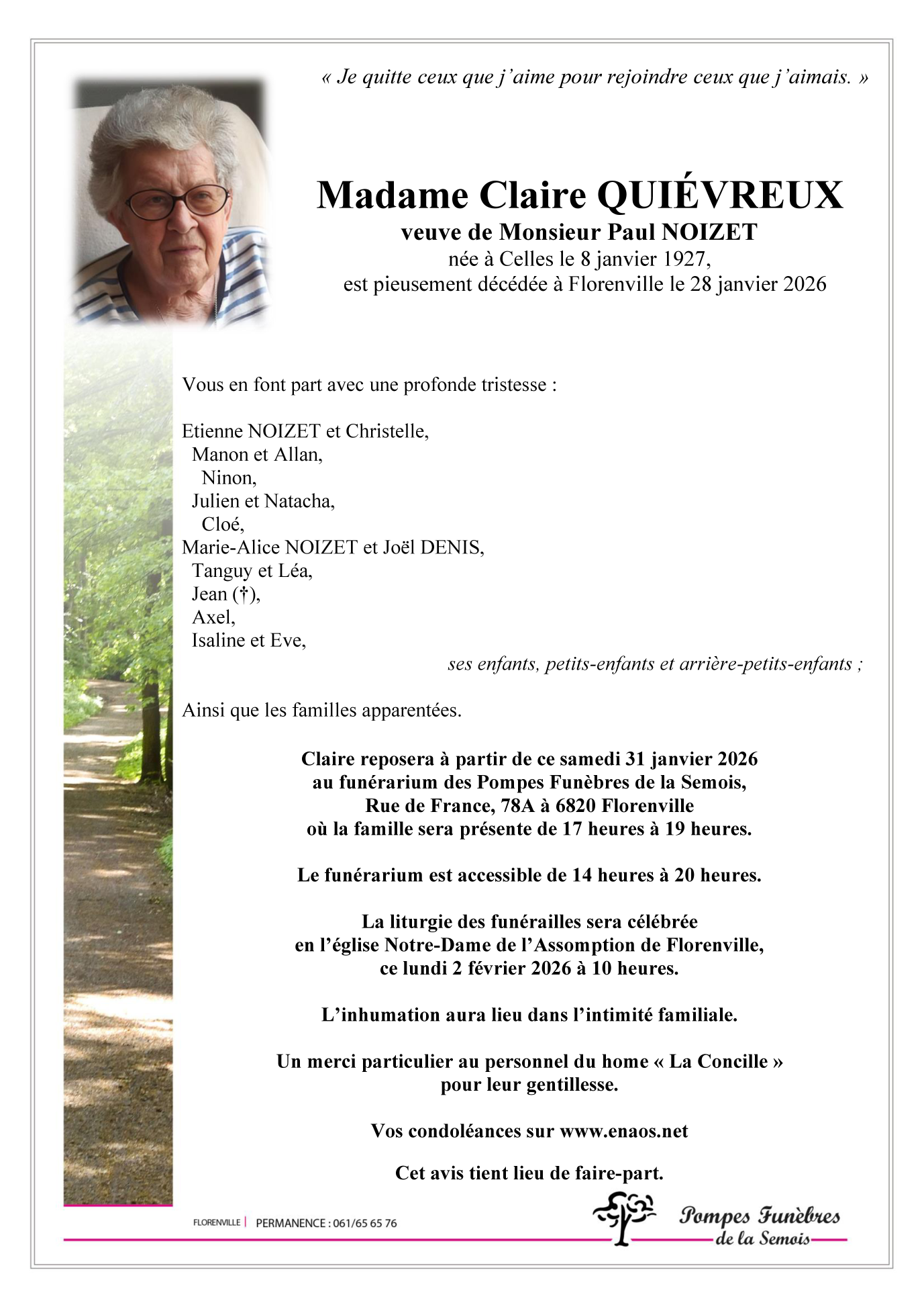 Décédée à Florenville (6820) le mercredi 28 janvier 2026 à l'âge de 99 ans