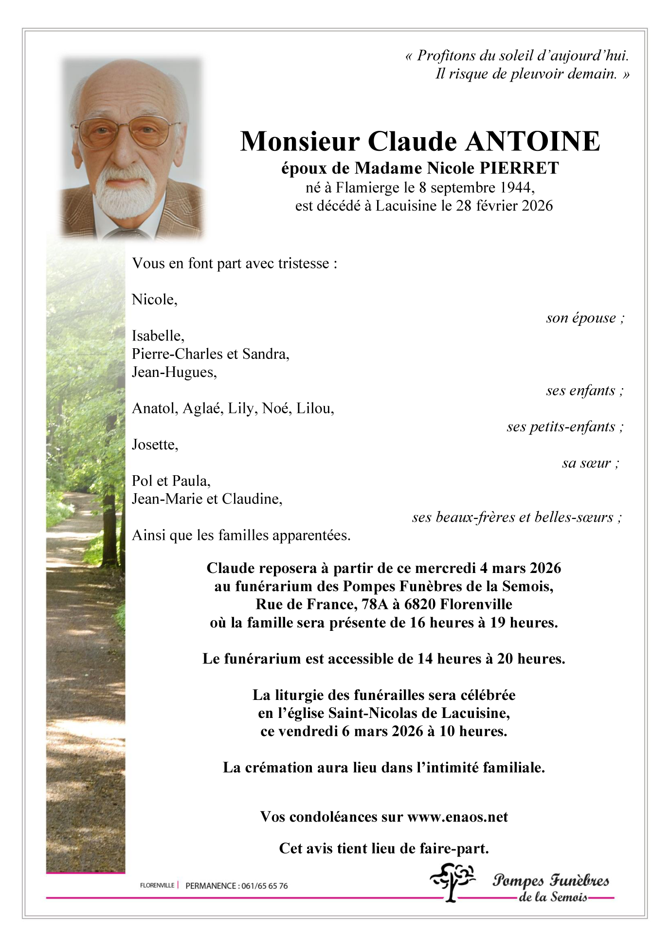 Décédé à Lacuisine (6821) le samedi 28 février 2026 à l'âge de 81 ans