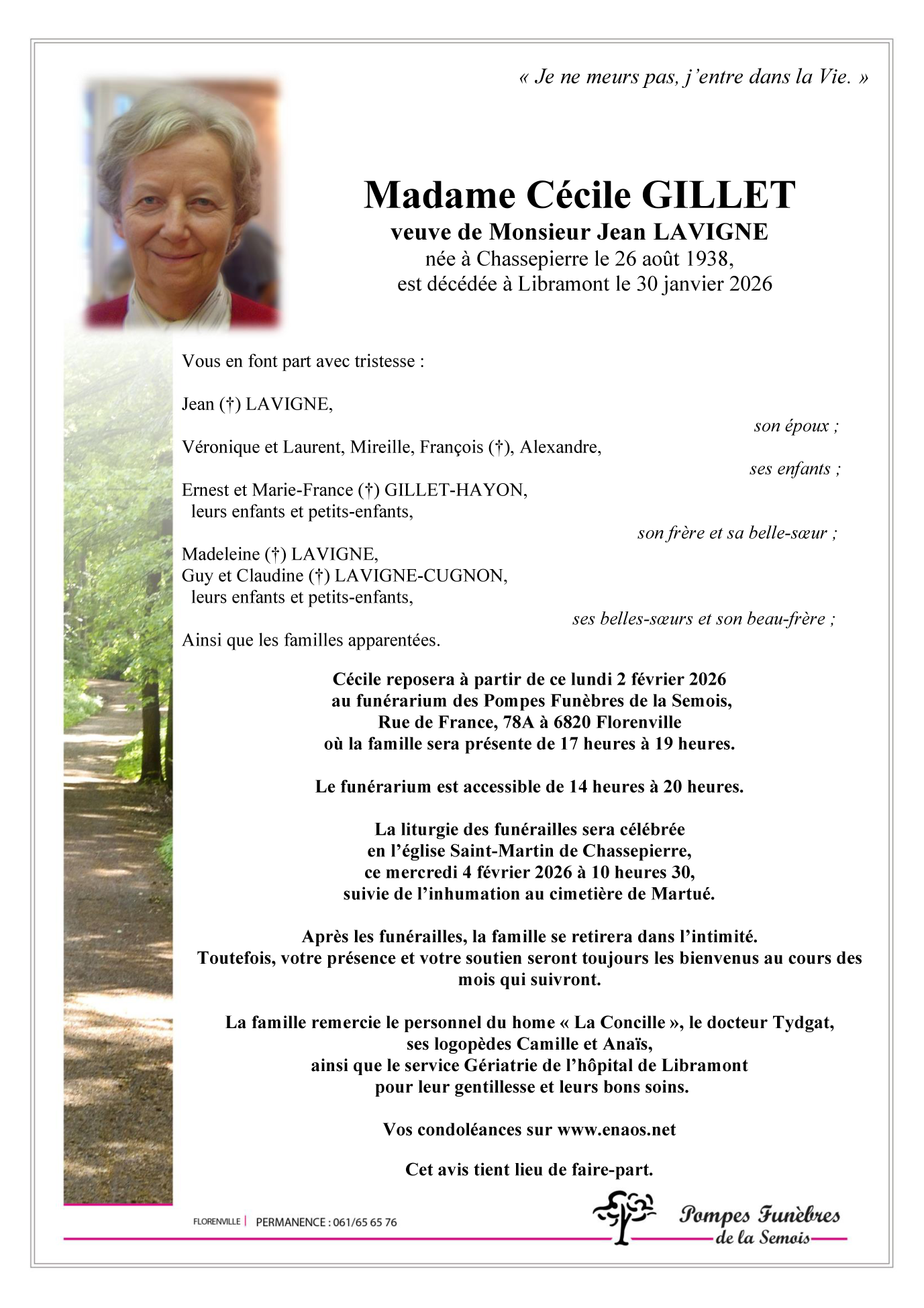 Décédée à Libramont-Chevigny (6800) le vendredi 30 janvier 2026 à l'âge de 87 ans